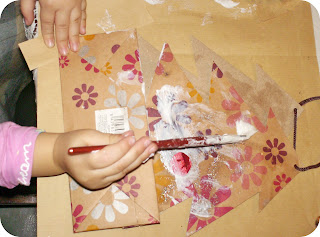 Primeiro cortámos o perfil de uma árvore no saco e depois a L. decorou o saco com pequenos círculos e fitas.